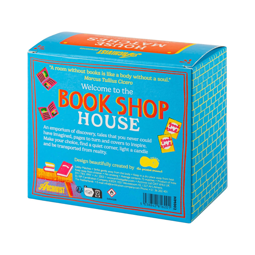 This beautifully designed house shaped matchbox features a delightful illustration of a bookshop. From high streets to homes, this nostalgic and colourful collection of House Matches is catnip for matchbox collectors. Both decorative and practical, they’re perfect perched on a kitchen shelf, bathroom ledge, or beside your favourite candle — a little everyday magic, ready to strike. Contains 75 matches, each measuring 10cm long, natural match sticks with green and white tips. These matches are made from natural product and may contain inherent structural flaws. Whilst time is taken to test the matches, cannot reasonably test every single one, so strike the match gently (easy does it!) and away from you, over non-combustible surfaces. Made in India and Printed on FSC certified board.