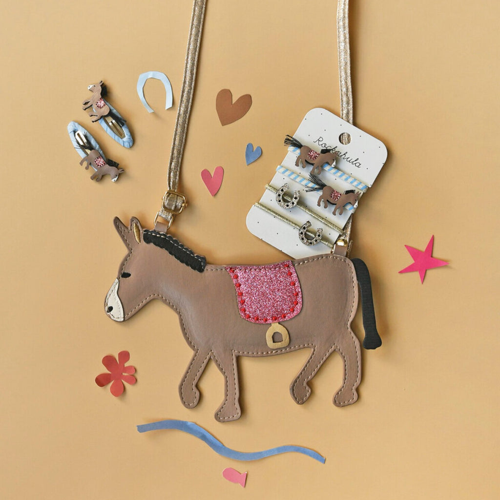 This beautiful set of 2 hair clips by Rockahula is just what you need to updo your hair in a super cute way. Featuring two sweet ponies secured to a gold glitter ribbon wrapped snap clip. The perfect accessory for a fun look! Please note this product is not suitable for children under 36 months due to small parts.
