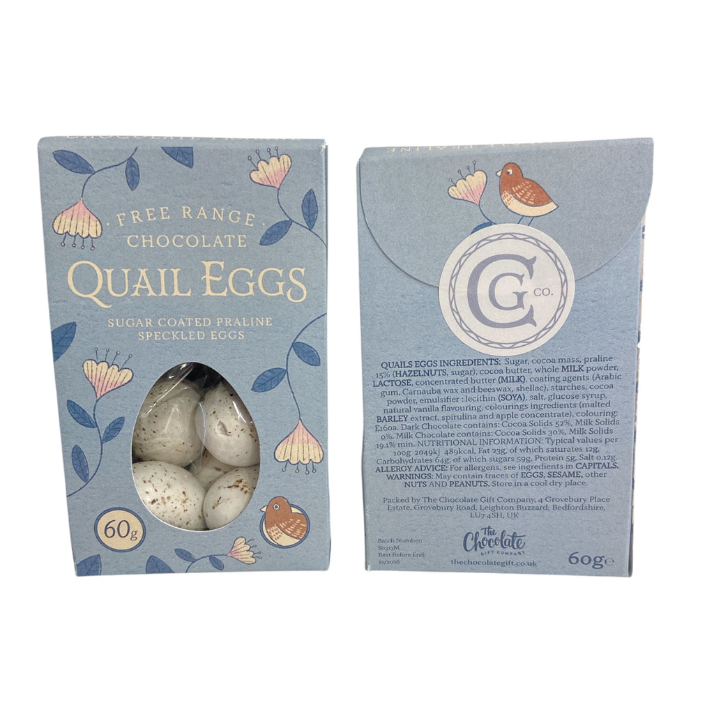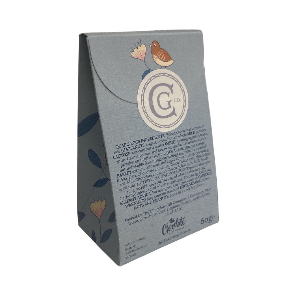 A scrumptious Easter treat, these delicious milk chocolate quail eggs have a crunchy sugared shell making the perfect sweet treat. Inside the beautifully illustrated pouch you will find a batch of 5 almost life size eggs, with a perfectly speckled finish. Dimensions 9 x 7 x 4 cm, weight 60 grams. Please note this product is not suitable for little ones.