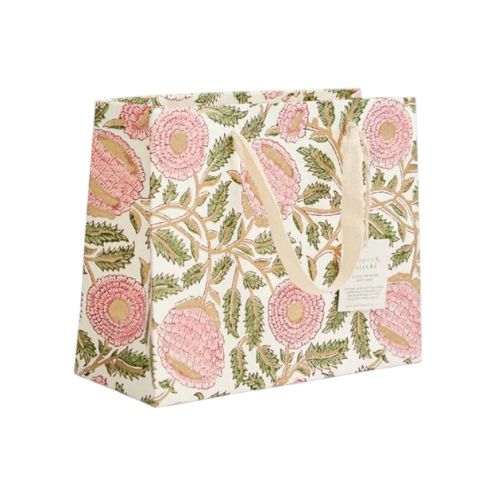 This premium gift bag has been hand block printed onto ivory cotton paper using three separate block prints for each colour ink. Each colour is stamped one at a time by skilled artisans who achieve a stunning result with every sheet that they print. This floral repeat pattern features a beautiful sweeping trellis and shimmering soft gold ink that brings the design to life. Hand block printed in India. Bag measures 28 x 35 x 14 cm, with soft cotton ribbon handles and printed onto 100% recycled cotton paper.