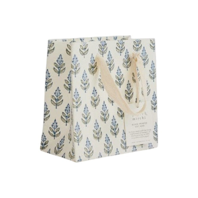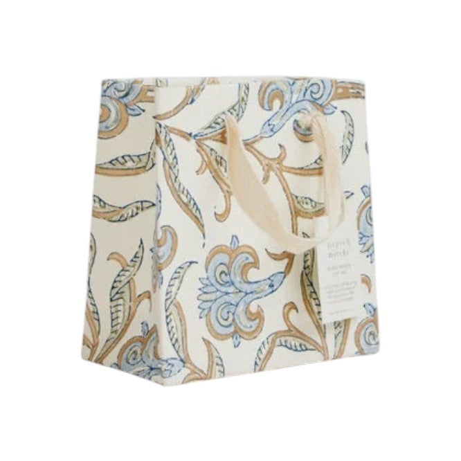 This premium gift bag has been hand block printed onto ivory cotton paper using three separate block prints for each colour ink. Each colour is stamped one at a time by skilled artisans who achieve a stunning result with every sheet that they print. This floral repeat pattern features a beautiful sweeping trellis and shimmering soft gold ink that brings the design to life. Hand block printed in India. Bag measures 20 x 25 x 10 cm, with soft cotton ribbon handles and printed onto 100% recycled cotton paper.