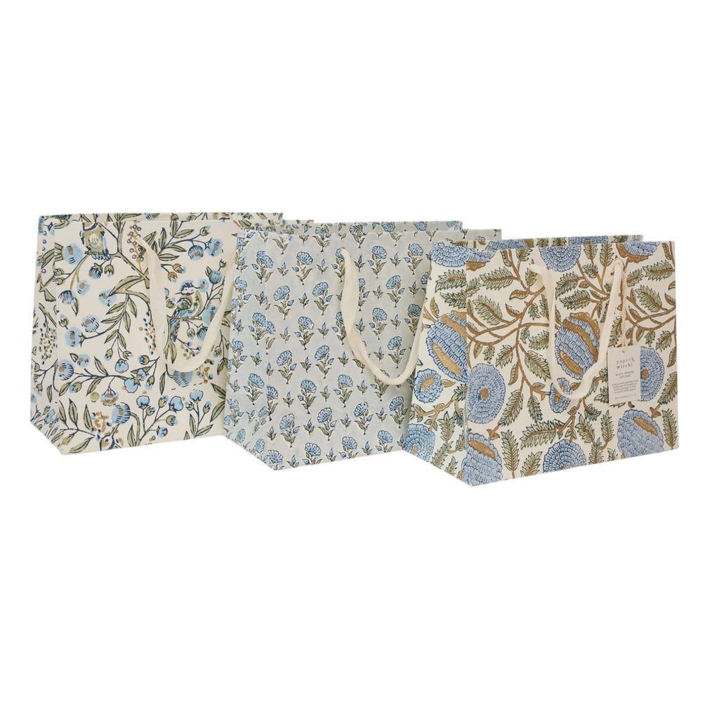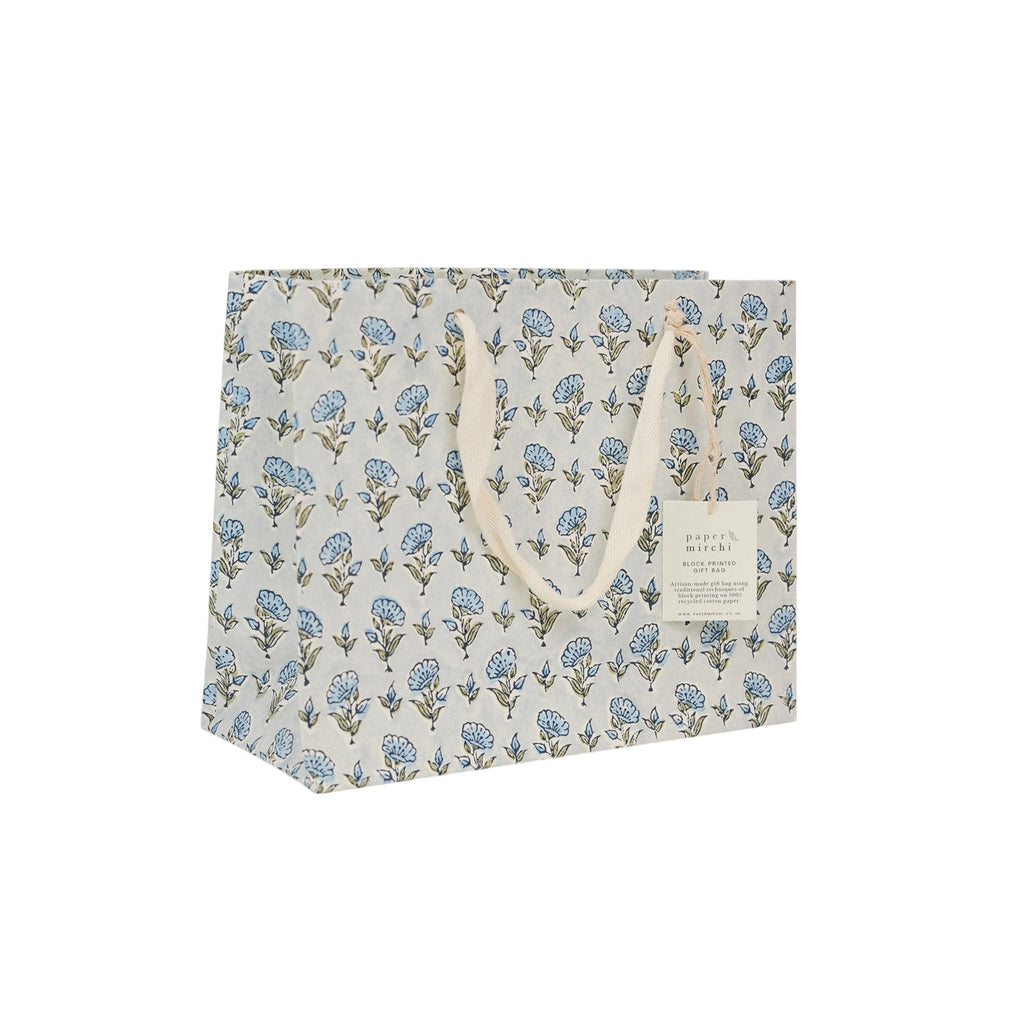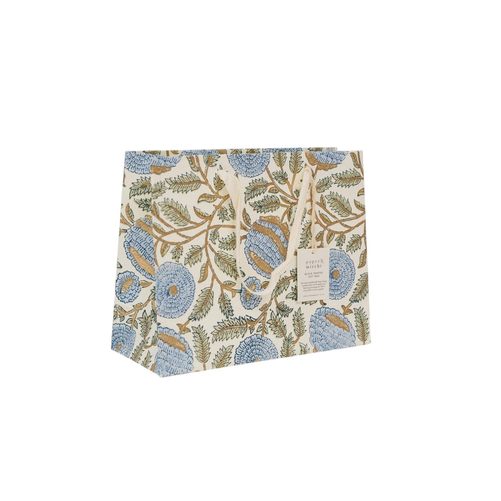 This premium gift bag has been hand block printed onto ivory cotton paper using three separate block prints for each colour ink. Each colour is stamped one at a time by skilled artisans who achieve a stunning result with every sheet that they print. This repeat pattern features beautiful florals and shimmering soft gold ink that brings the design to life. Hand block printed in India. Bag measures 20 x 25 x 10 cm, with soft cotton ribbon handles and printed onto 100% recycled cotton paper.
