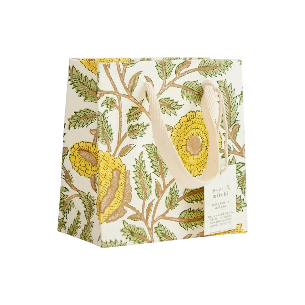This premium gift bag has been hand block printed onto ivory cotton paper using three separate block prints for each colour ink. Each colour is stamped one at a time by skilled artisans who achieve a stunning result with every sheet that they print. This floral repeat pattern features a beautiful sweeping trellis and shimmering soft gold ink that brings the design to life. Hand block printed in India. Bag measures 20 x 25 x 10 cm,cm, with soft cotton ribbon handles and printed onto 100% recycled cotton paper.