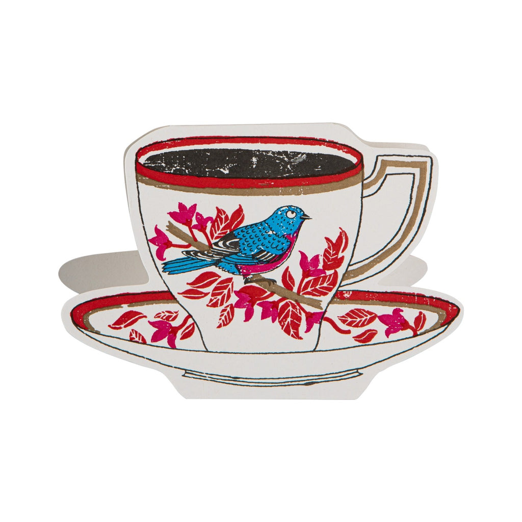 Expertly printed by Archivist and designed by Charlotte Farmer this card features an elegant tea cup and saucer with a little blue bird on the front. Brighten up someone's day with this delightful card that will be sure to stay out on display long after its received. This card has been printed on card that is FSC accredited booth the card and the wrapping are 100% compostable. Blank inside for your own special message and comes with a coordinating envelope. Sized 17.8 cm x 12.7 cm letter press printed in the UK.