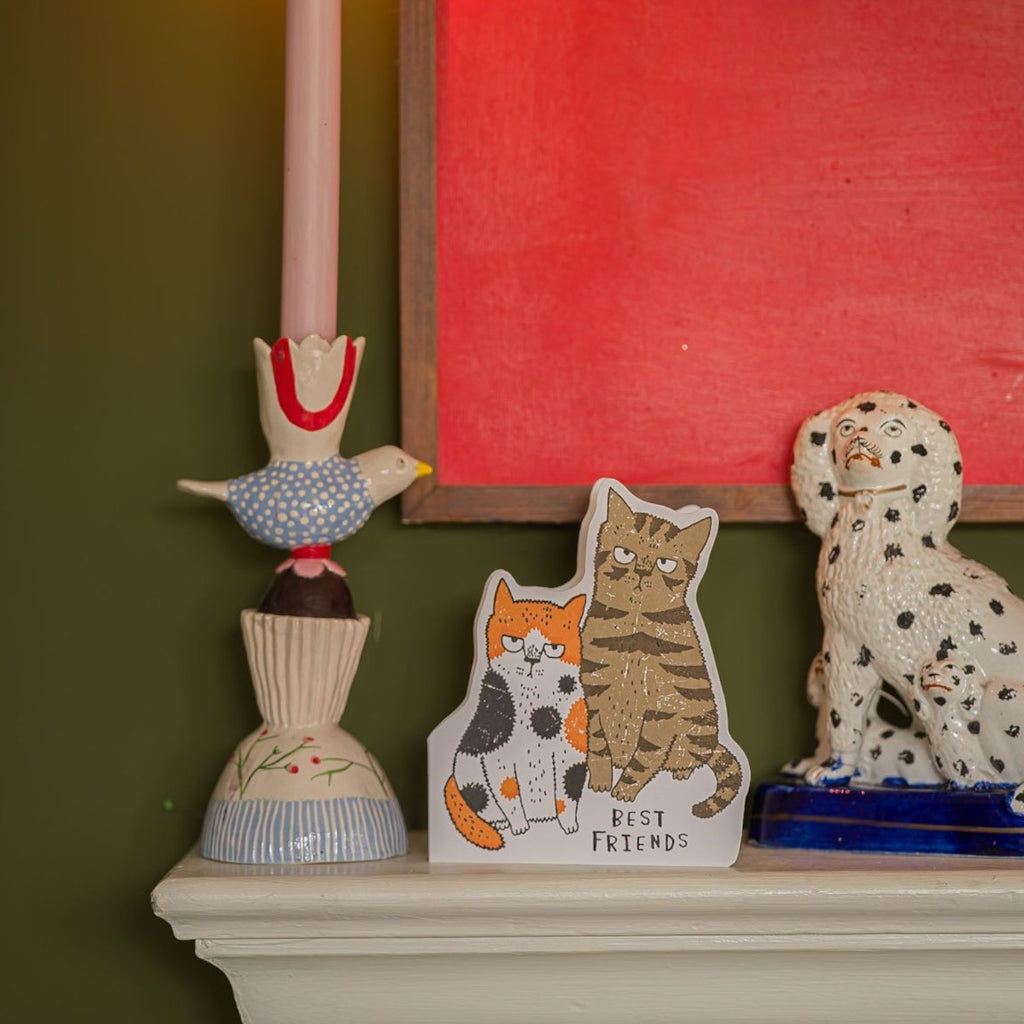 Expertly printed by Archivist this card features two grumpy cats sitting beside each other with the words 'Best Friends.' Designed by Charlotte Farmer. Brighten up someone's day with this delightful card that will be sure to stay out on display long after its received. This card has been printed on card that is FSC accredited booth the card and the wrapping are 100% compostable. Blank inside for your own special message and comes with a coordinating envelope. Sized 17.8 cm x 12.7 cm letter press printed in the UK.