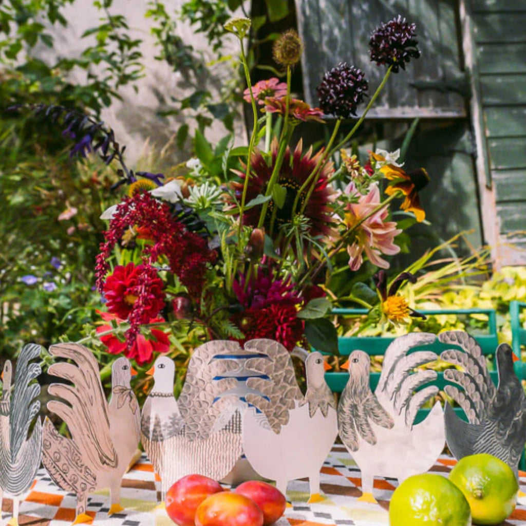 For any fun occasion this beautiful row of fancy chickens on a fold-out card will be sure to stand out! Each chicken's plumage is made from collaged antique etchings; the glossy hair and ruffs from the Elizabethan gentry were repurposed to become poultry. Created from FSC card with space to write a special message and comes with an envelope made from a mix of recycled paper and citrus peels. Created by Hadley, designed, made, distributed in the UK. This card is environmentally friendly made from recycled paper that is compostable and has plastic free packaging.