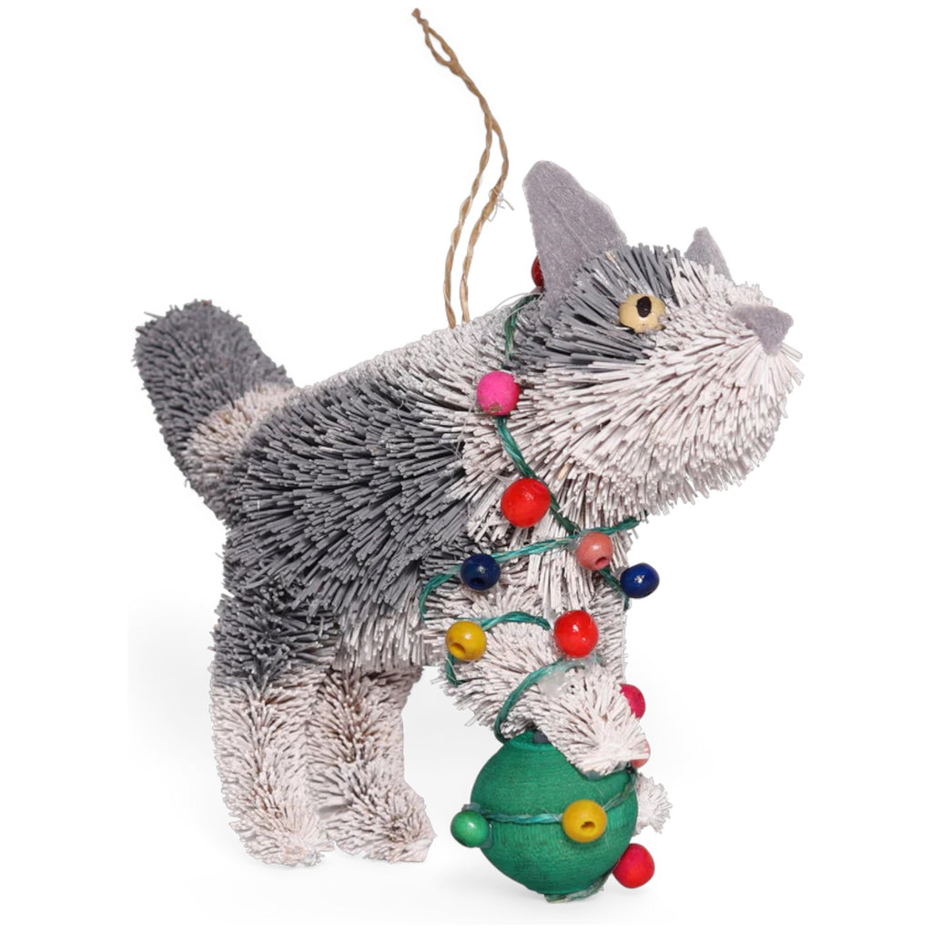 Add a touch of charm with this festive bristle cat decoration. Ideal for adorning your Christmas tree, decorating wreaths or for bring a touch of festive enchantment to your mantle piece. This decoration has been handmade in the Philippines by skilled artisans using the natural fibres of the Buri plant. Each piece is carefully crafted and may vary slightly from one another. Product measures 12cm.