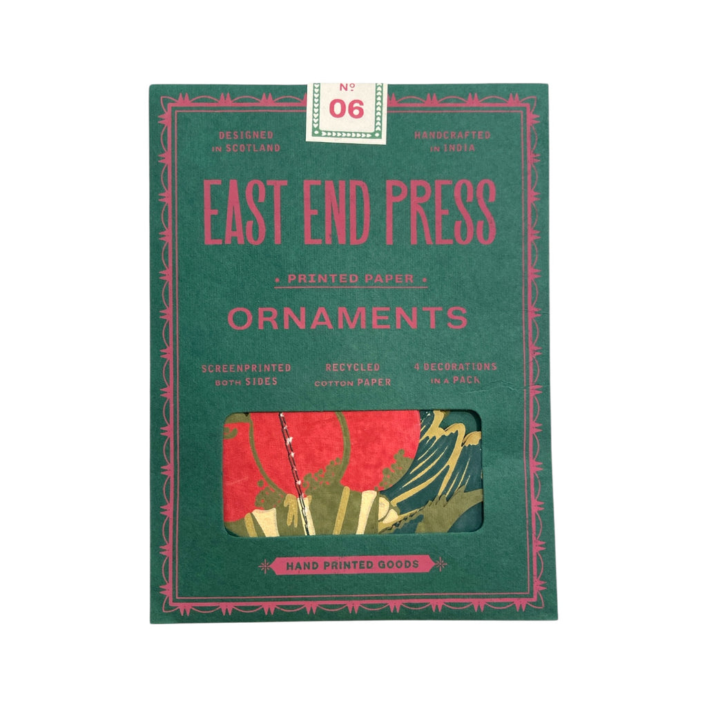 Add a glorious touch to your room decor with these hand printed colourful paper festive foliage by East End Press. Featuring 4 assorted foliage sprigs, each with a double layer of brightly printed paper, simply fold them out to make a three dimensional shape. Each bauble has a handy wax thread for hanging. These decorations have been printed onto durable card and are designed to be reused. Beautifully printed by hand in Jaipur. Decorations come on a paper sheet to prevent any tangles. Pack contains 4 baubles measuring 14 cm at its widest point, hanging loops measure 10 cm. All of the factories that East End Press works with are independently audited and belong to SEDEX, an international organisation that is dedicated to driving improvements in ethical and responsible business practices in global supply chains.