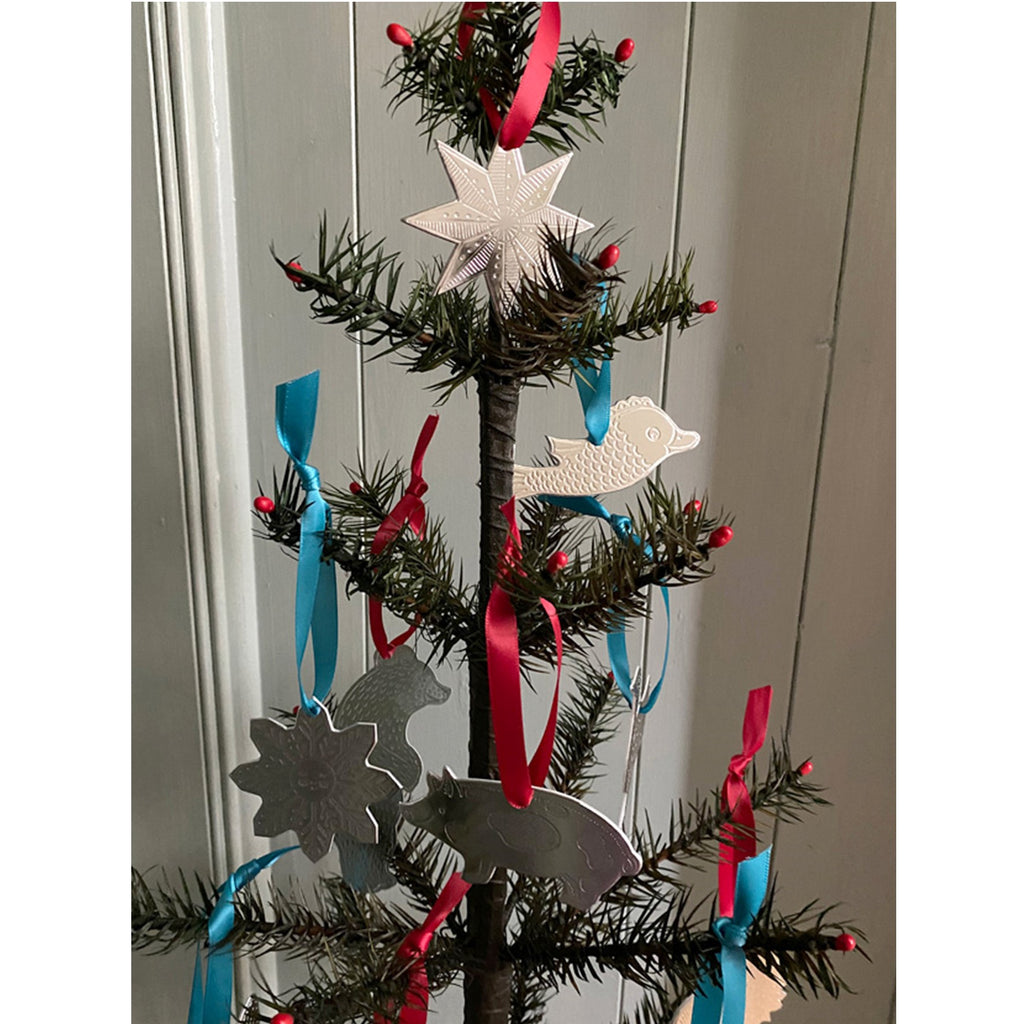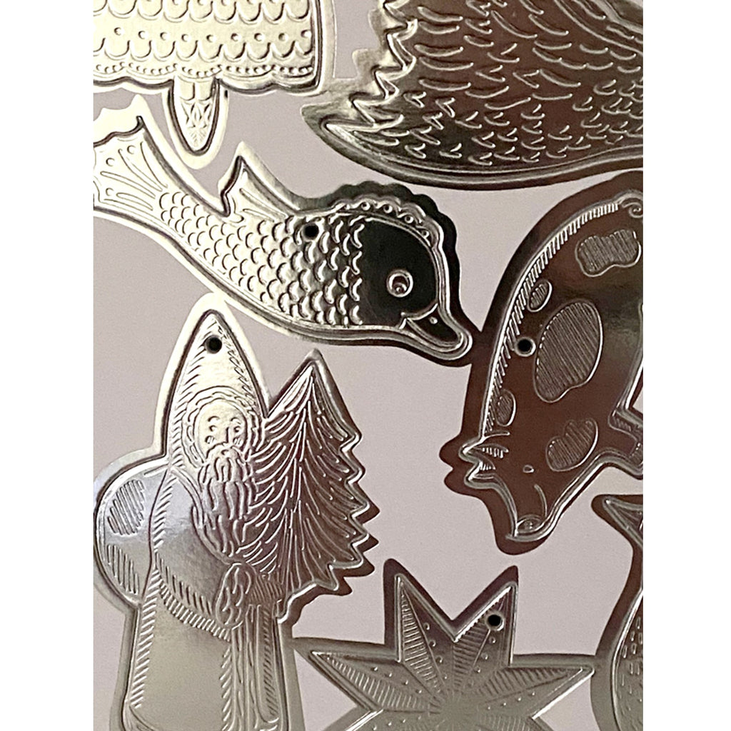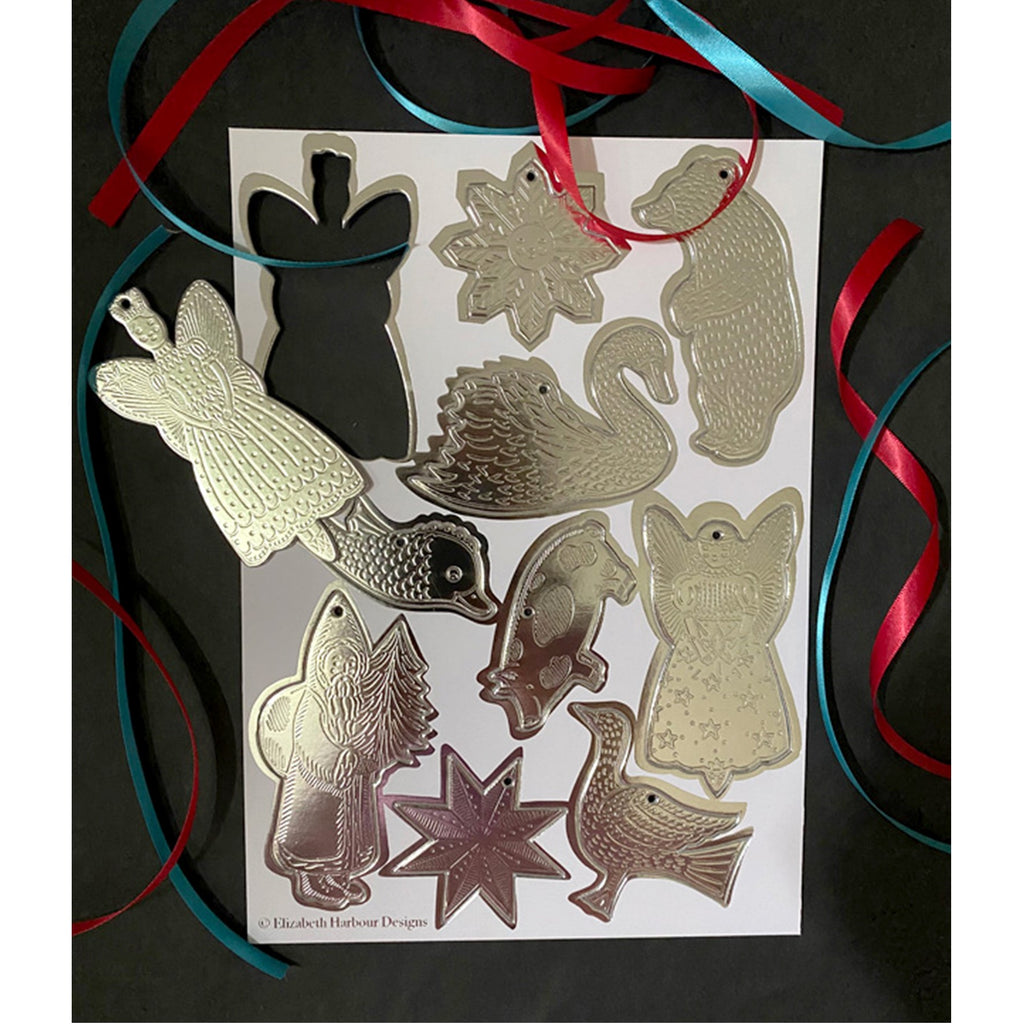 This set of 10 double sided Christmas decorations by Elizabeth Harbour will get your tree or mantle piece shimmering festively in no time. Gently pop out each decorations and thread on one of the silky ribbons that come in the pack and your ready to go. Each decoration features a festive embossed design that is silver on both sides. Pack includes 10  FSC credited card decorations and 10 ribbon ties. These decorations are made from a sturdy cardboard that can be reused for years to come. Pack measures A4 210 x 297 mm and comes in a fully compostable bag. Made in England. Elizabeth Harbour lives and creates in rural Kent, her home is surrounded by trees and birds forming inspiration for her collections.