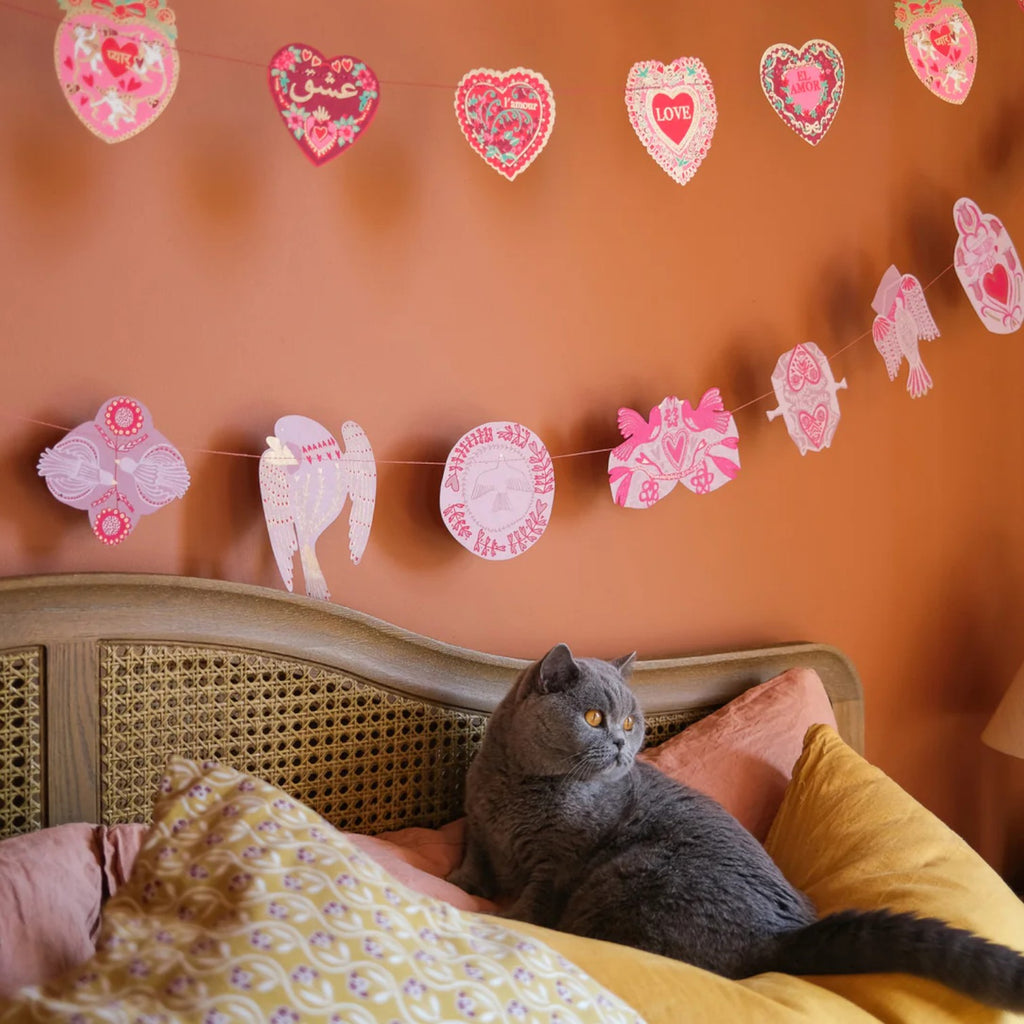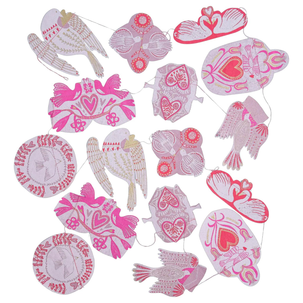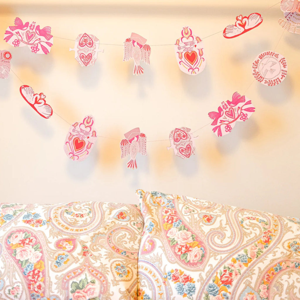 Add a glorious touch to your valentine decor with this hand printed garland by East End Press. Featuring 20 sweet love birds each with floral colourful prints on both sides sewn onto a wax thread. This garland has been printed onto durable card and is designed to be reused. Beautifully printed by hand in Jaipur. Garland comes on a paper sheet to prevent any tangles. Garland length 3 meters with hanging loops on each end. All of the factories that East End Press works with are independently audited and belong to SEDEX, an international organisation that is dedicated to driving improvements in ethical and responsible business practices in global supply chains.