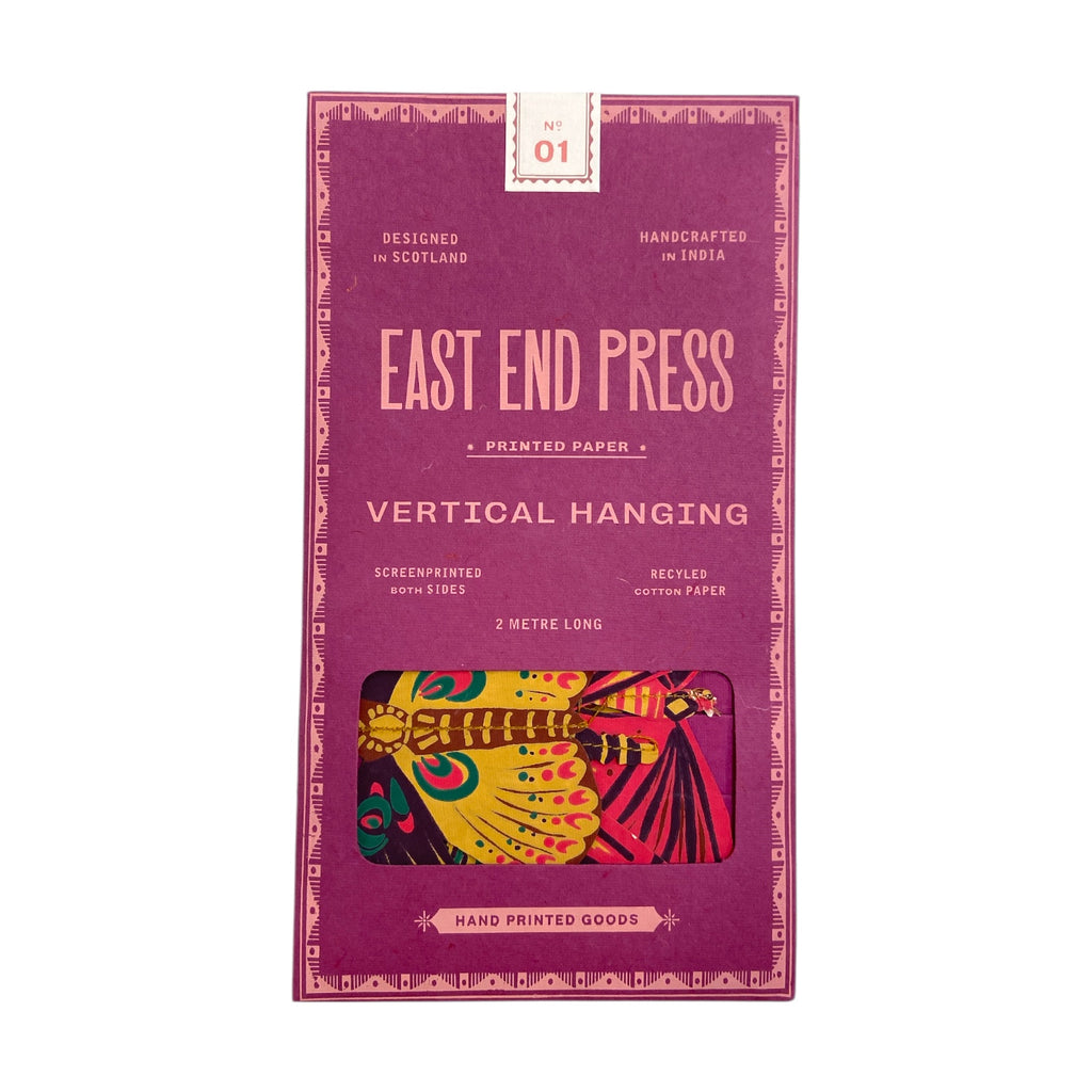 Created from brightly coloured screen printed paper this stunning vertical garland features 9 decorative butterflies each with its own decorative markings, these are then sewn together to make a garland up to 2 meters in length. Perfect for bighting up a room or making an ideal alterative to a mobile. This garland is printed on both sides and has hanging loops at either end. When not in use simply fold back up and stored in the handy paper envelope ready for the next occasion. Garlands are created in a safe, fair working environment and are made from AZO free nontoxic water based inks and always 100% recycled content paper. Hand made in India.