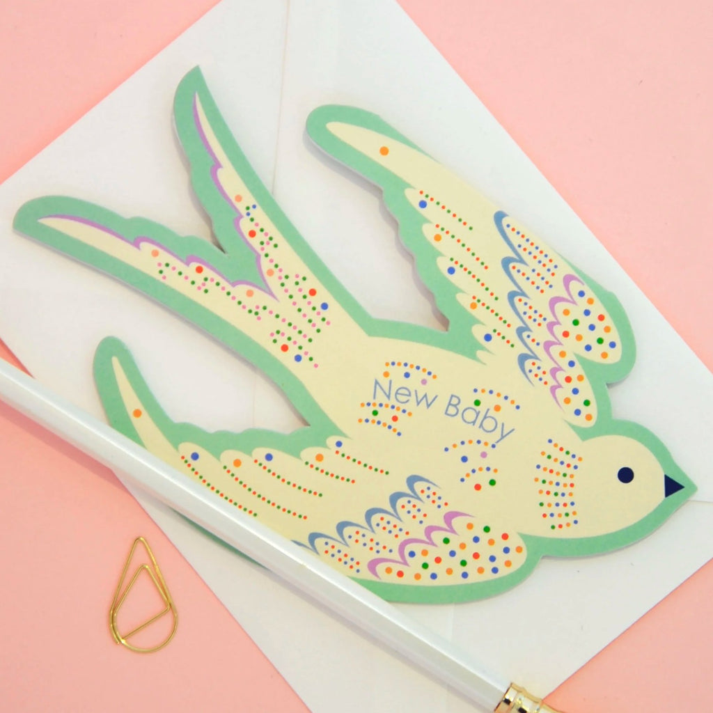 Welcome a new arrival with this delightful die-cut new baby card in soft mint green, adorned with cheerful, multicoloured dots. Its unique rocking design makes it a keepsake to treasure, perfect for displaying on a mantelpiece or nursery shelf. More than just a card, it’s a charming little gift in itself. Printed on premium FSC®‑certified card and left blank inside, it offers space for your own heartfelt message. Includes 114 x 162mm envelope. Designed & printed in the UK.