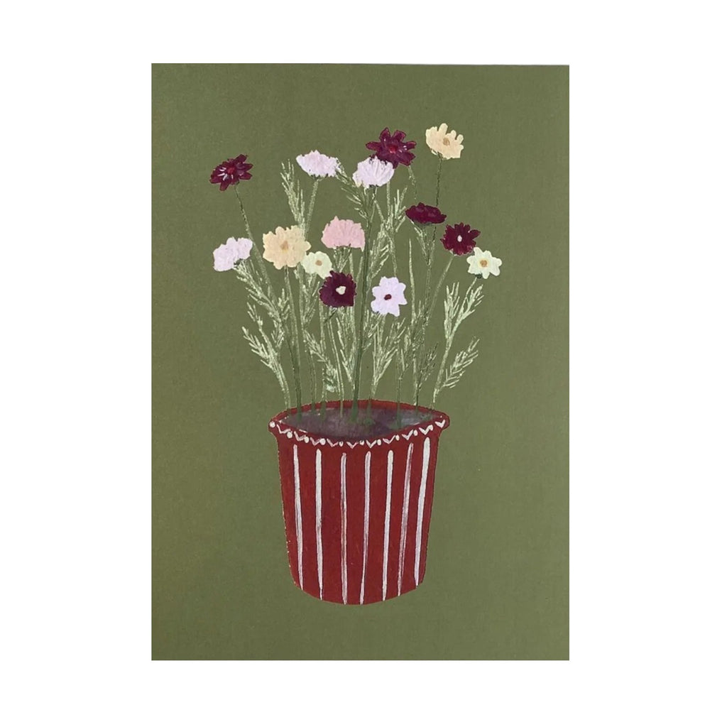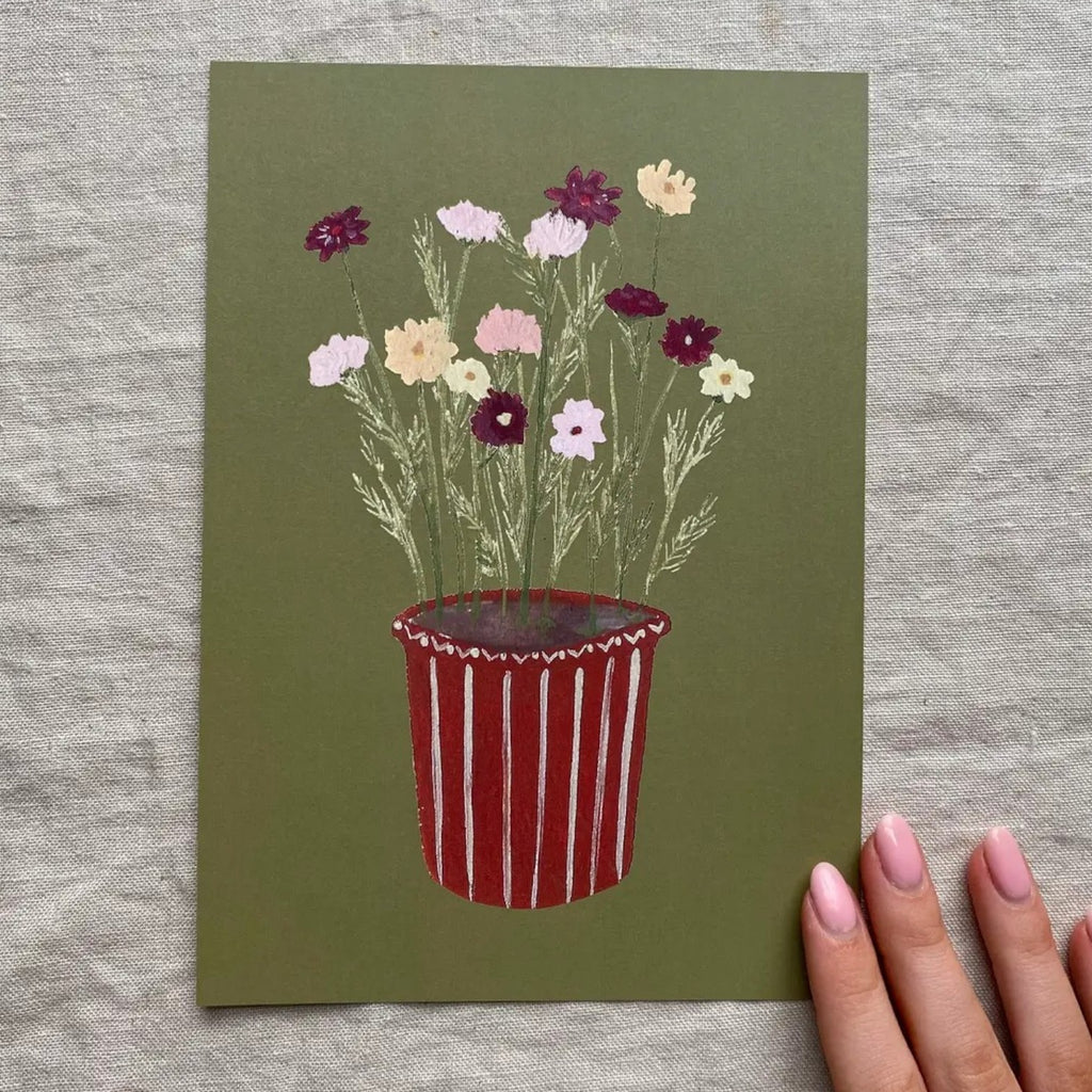 Add a touch of charm to any room with this hand painted cosmos floral print. Hand painted in Gouache, and printed in England on textured part recycled paper at 300gsm. This cheerful print is inspired by the spring and summer blooming flowers. Backed and protected by a cellophane sleeve.