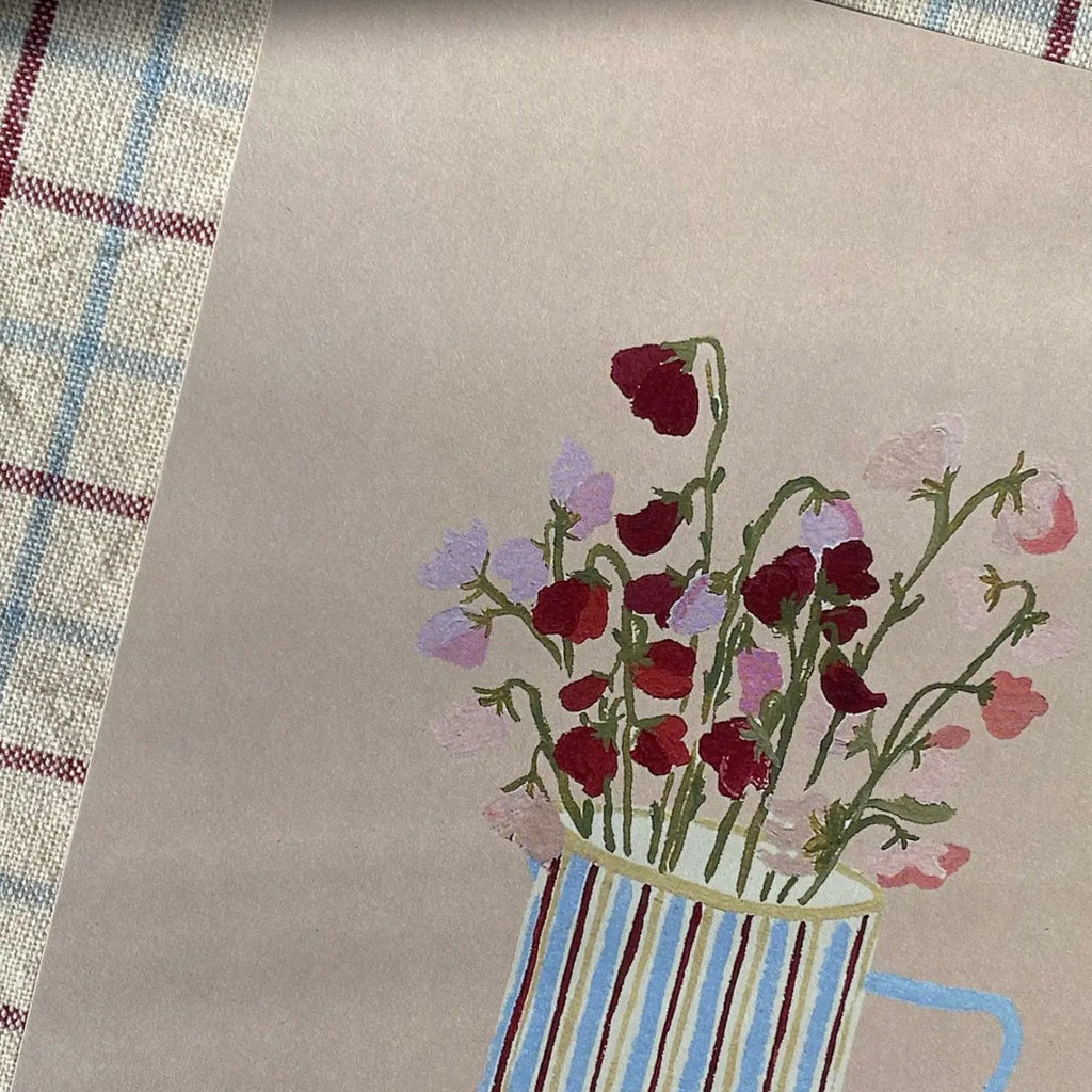 Add a touch of charm to any room with this hand painted sweet pea floral print. Hand painted in Gouache, and printed in England on textured part recycled paper at 300gsm. This cheerful print is inspired by the spring and summer blooming flowers. Backed and protected by a cellophane sleeve.