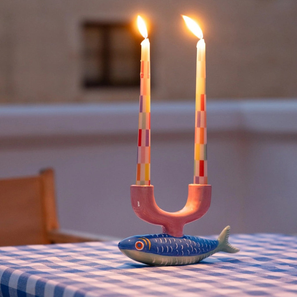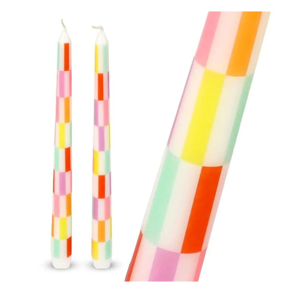 Add a touch of joyful colour with this pack of 2 tapered floral dinner candles. Their bright and fun style is sure to stand out on your table or mantlepiece. Candles are unscented, burn for up to 5 hours and measure 23cm in height. Keep out of reach of children.