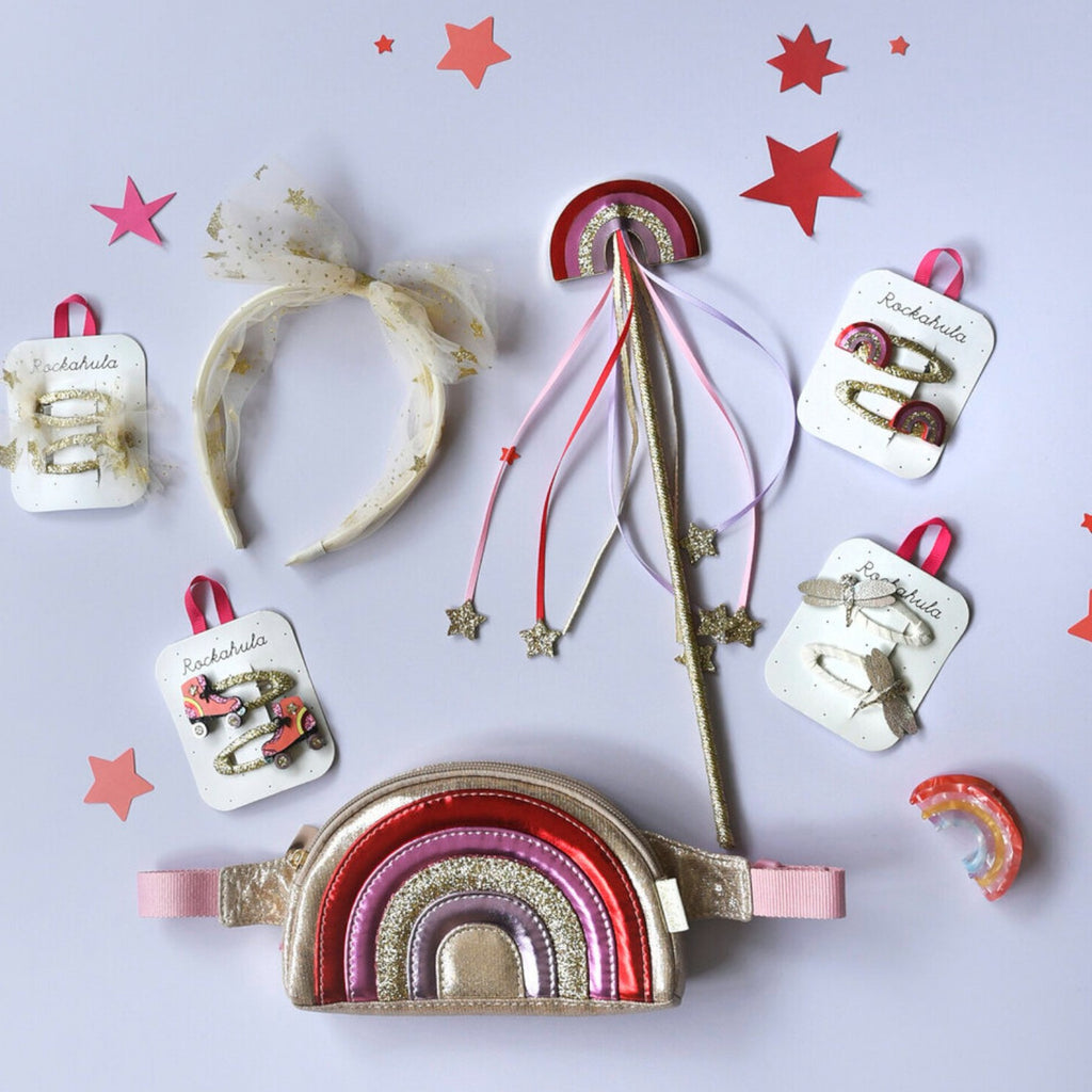 This beautiful set of 2 hair clips by Rockahula is just what you need to updo your hair in a super cute way. Featuring two shimmering glitter and PU rainbows secured to a gold glitter ribbon wrapped snap clip. The perfect accessory to take disco dancing! Please note this product is not suitable for children under 36 months due to small parts.