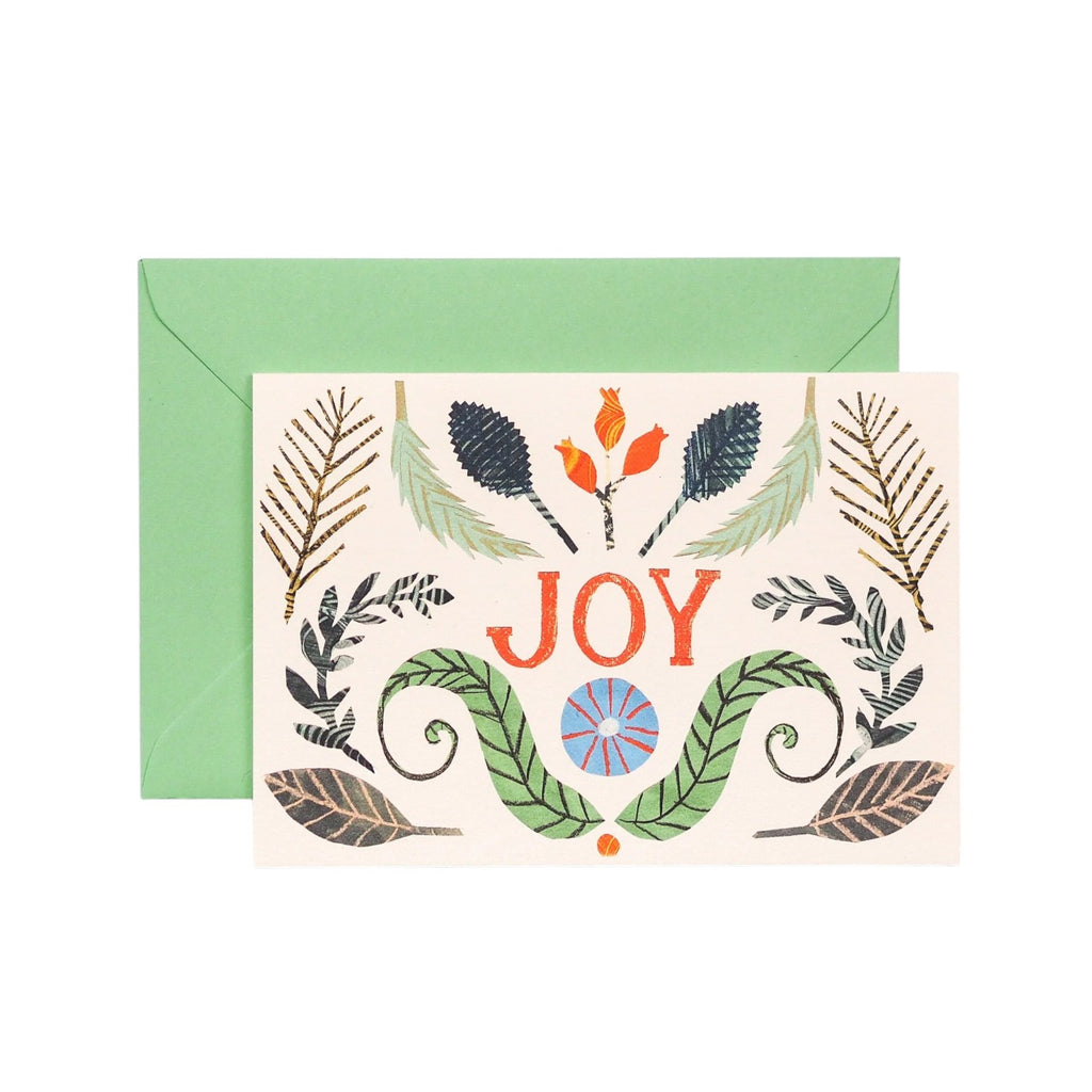 This card makes the perfect way to send a happy festive message. Featuring sweeping festive foliage and berry sprigs beautifully set around text that reads 'Joy'. Printed on high quality 300gsm card with crisp ivory white elegant envelope. This card has been left blank inside so there will be plenty of room for your message. Card measures 11.5 x 15 cm. Created by Hadley, designed, made, distributed in the UK. This card is environmentally friendly made from recycled paper that is compostable and has plastic free packaging.