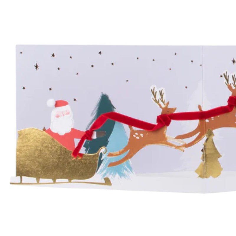 A standout way to spread festive cheer, this delightful card by Meri Meri features Santa's sleigh and four velvet ribbon reined leaping reindeers. This Christmas card is guaranteed to get pride of place on the mantel or card display! Comes with a card insert with shiny gold foil to write your message, and a co-ordinating envelope. Inside message: Seasons Greetings and Best Wishes for a Happy new Year. Product dimensions: 17.8 x 12.7 cm.