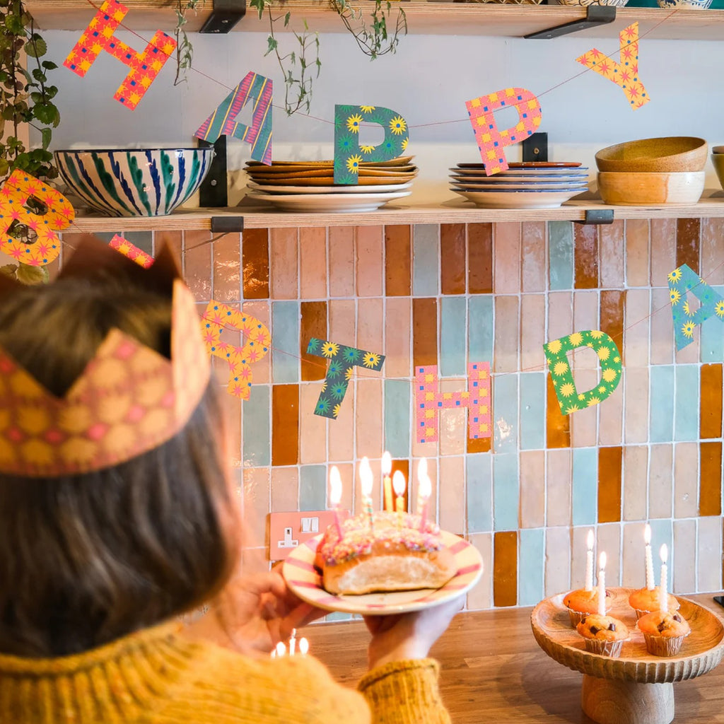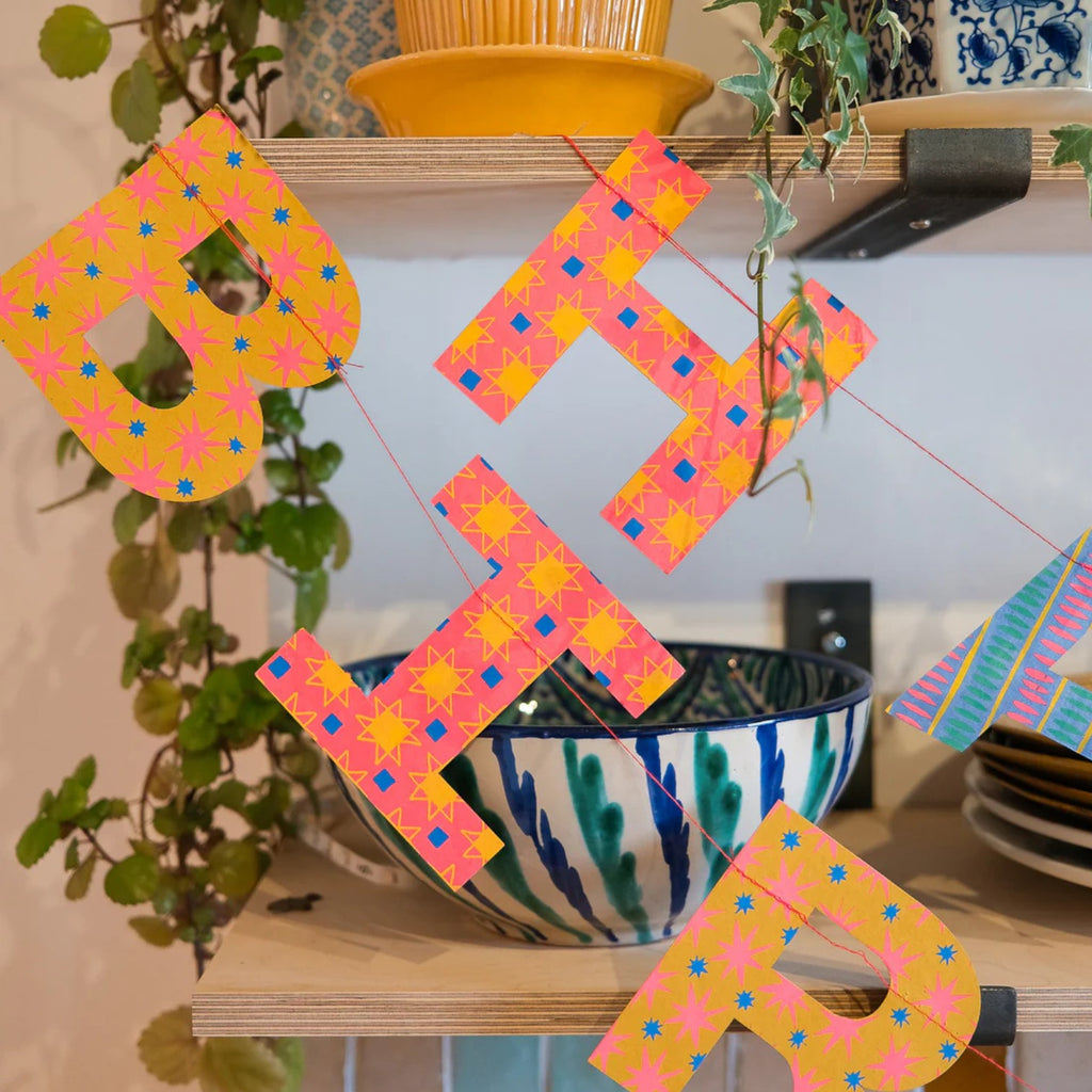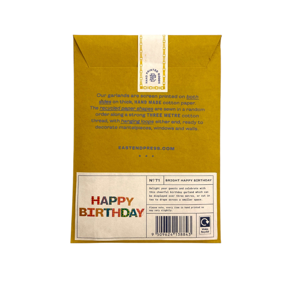 Add a glorious touch to your birthday decor with this hand printed garland by East End Press. Featuring the phrase Happy Birthday, each letter has a different colourful design and print on both sides sewn onto a wax thread. This garland has been printed onto durable card and is designed to be reused. Beautifully printed by hand in Jaipur. Garland comes on a paper sheet to prevent any tangles. Garland length 3 meters with hanging loops on each end. All of the factories that East End Press works with are independently audited and belong to SEDEX, an international organisation that is dedicated to driving improvements in ethical and responsible business practices in global supply chains.
