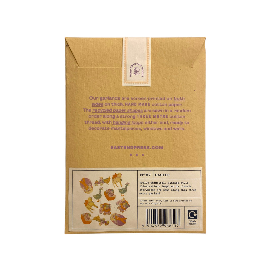 Add a glorious touch to your easter decor with this hand printed garland by East End Press. Featuring whimsical, vintage-style illustrations inspired by classic storybooks printed on both sides sewn onto a wax thread. This garland has been printed onto durable card and is designed to be reused. Beautifully printed by hand in Jaipur. Garland comes on a paper sheet to prevent any tangles. Garland length 3 meters with hanging loops on each end. All of the factories that East End Press works with are independently audited and belong to SEDEX, an international organisation that is dedicated to driving improvements in ethical and responsible business practices in global supply chains.