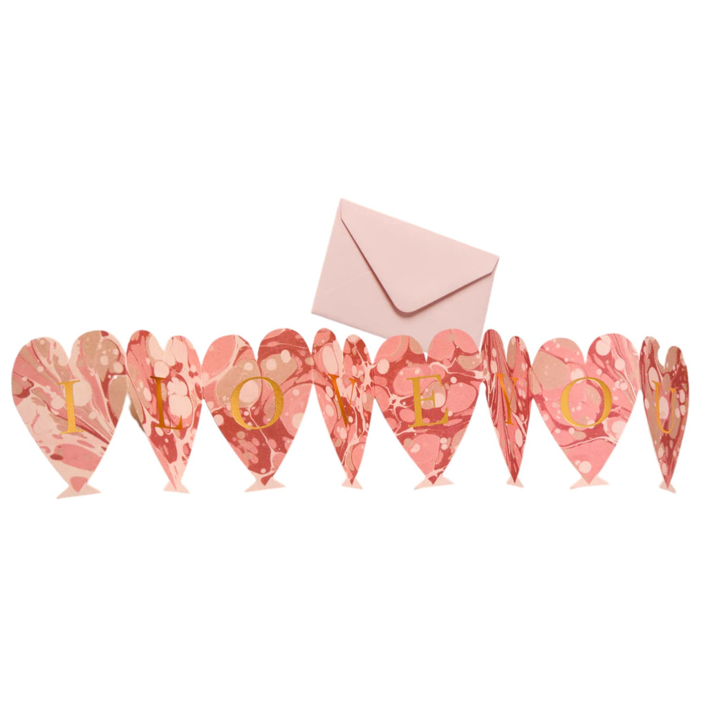 Created by Wanderlust Paper Co. this delightful mini concertina card features 8 marbled hearts each with a shimmery gold foil letter which reads the phrase I Love You. This card has been left blank inside so you can write your own personal message and comes paired with a luxury corresponding envelope. Designed and printed in the UK on FSC certified papers. Wanderlust is a small design studio based in Hove, where every greetings card is printed by hand on a vintage printing press.