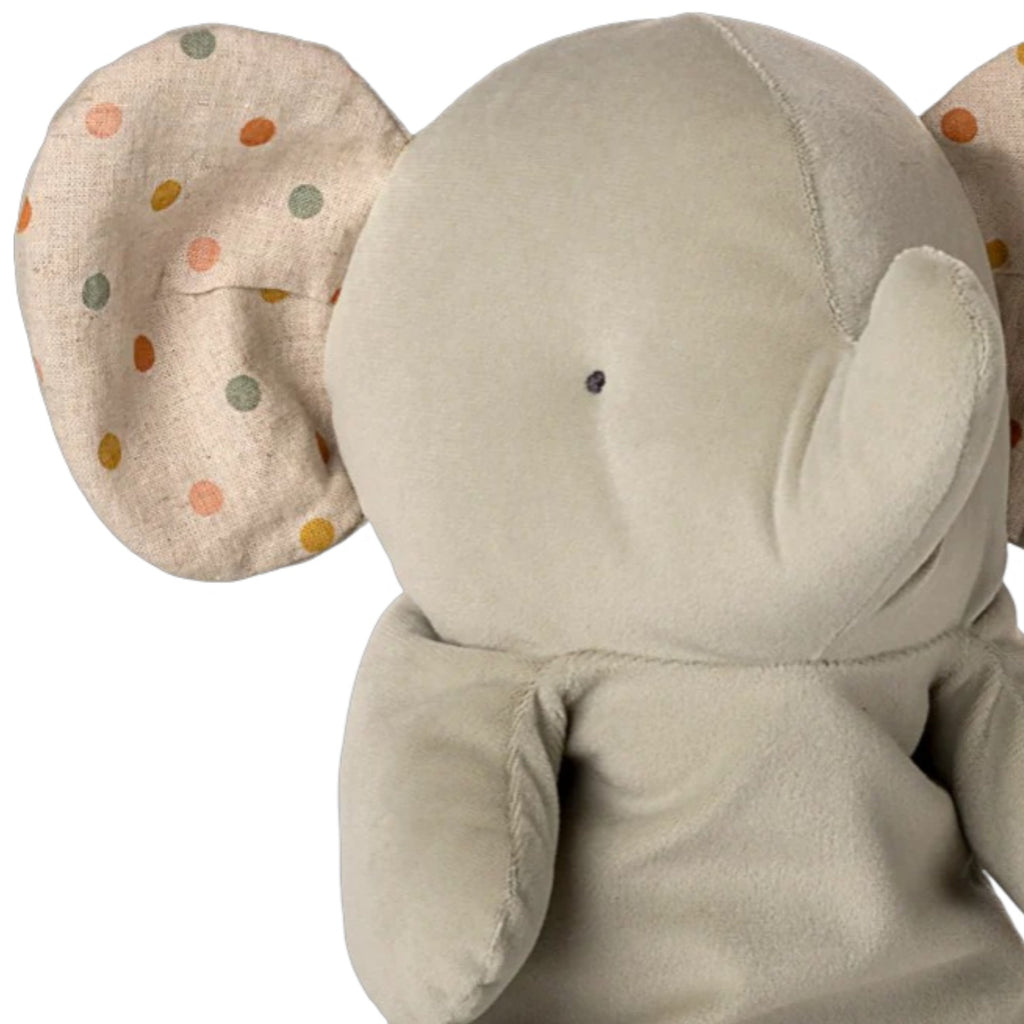 Created from the softest velvet fabric, this adorable Maileg elephant is suitable from birth and makes the perfect friend to snuggle up to. Featuring a happy little embroidered face and colourful polka dot print fabric ears this little elephant is sure to become a favourite in no time. Elephant length 34cm, suitable for all ages. Wash at 25 degrees. Made from polyester and filled with recycled polyester/PE pellets.