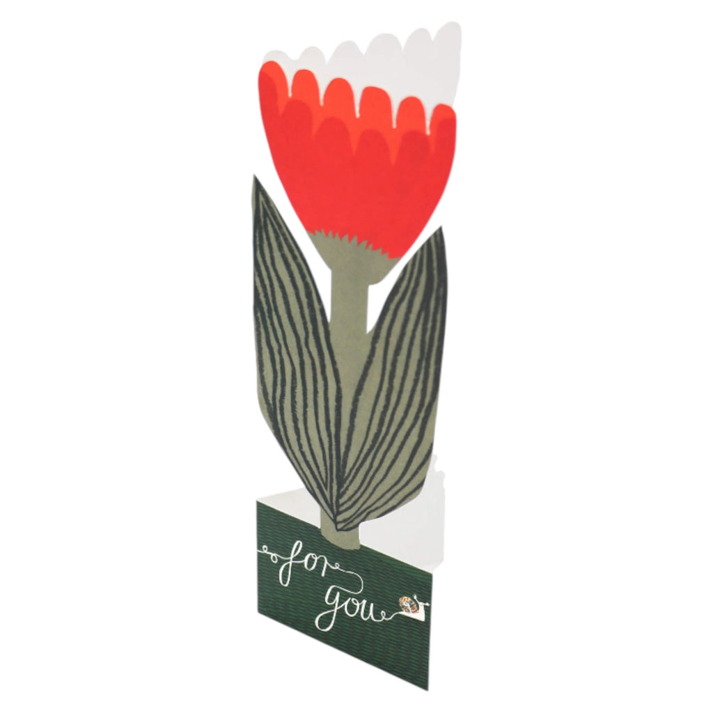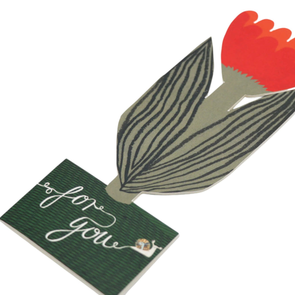 This beautiful tulip card folds out to become free standing with the message 'for you' on the base. Send a tulip to let that special person know you are thinking of them. This nature inspired stand-up card was designed in-house by Jo using collage techniques, a beautiful card and decoration all in one! Created from FSC card with space to write a special message and comes with an envelope made from a mix of recycled paper and citrus peels. Created by Hadley, designed, made, distributed in the UK. This card is environmentally friendly made from recycled paper that is compostable and has plastic free packaging.