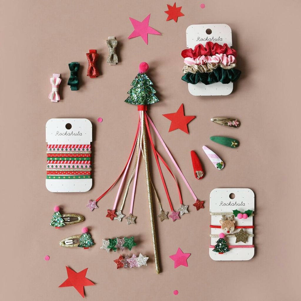 Pig tails or ponies? Whatever the style this set of 4 hairbands are a must for helping tame hair into a stylish updo. Add fun to an outfit or create the perfect look with this set of gorgeous hairbands featuring a shimmery golden star, little reindeer, holly and a glittery Christmas tree. Set contains four scrunchies on cardboard backing. Please note this product is not suitable for children under 36 months due to small parts.
