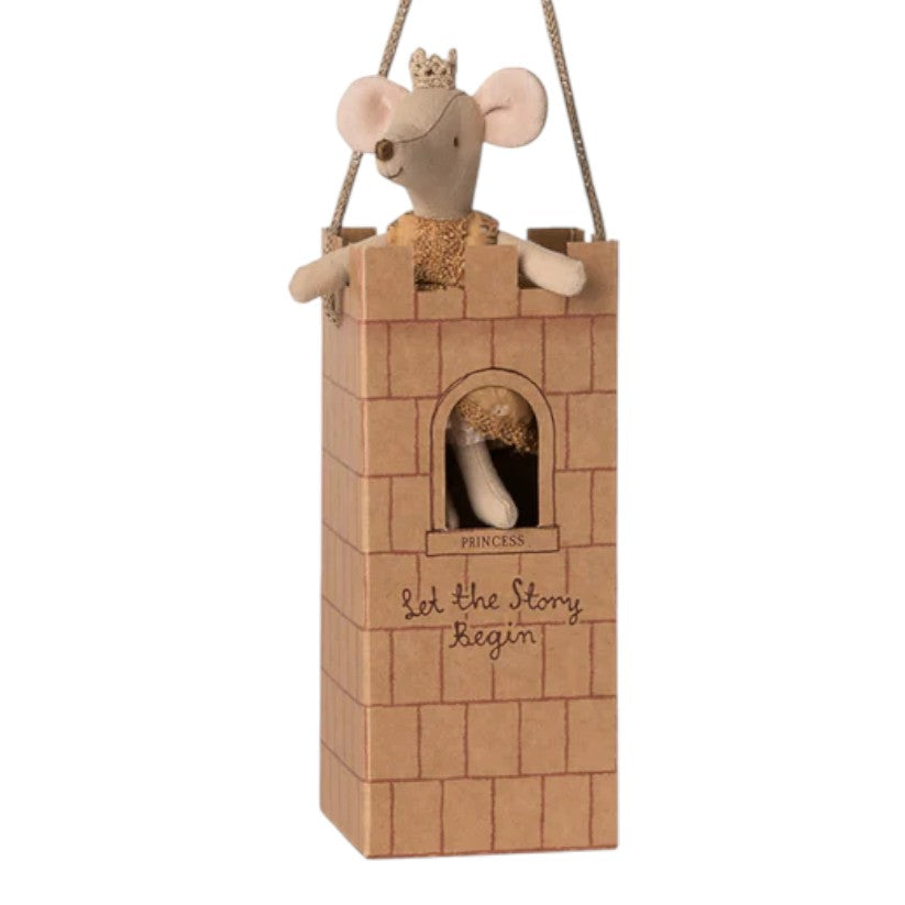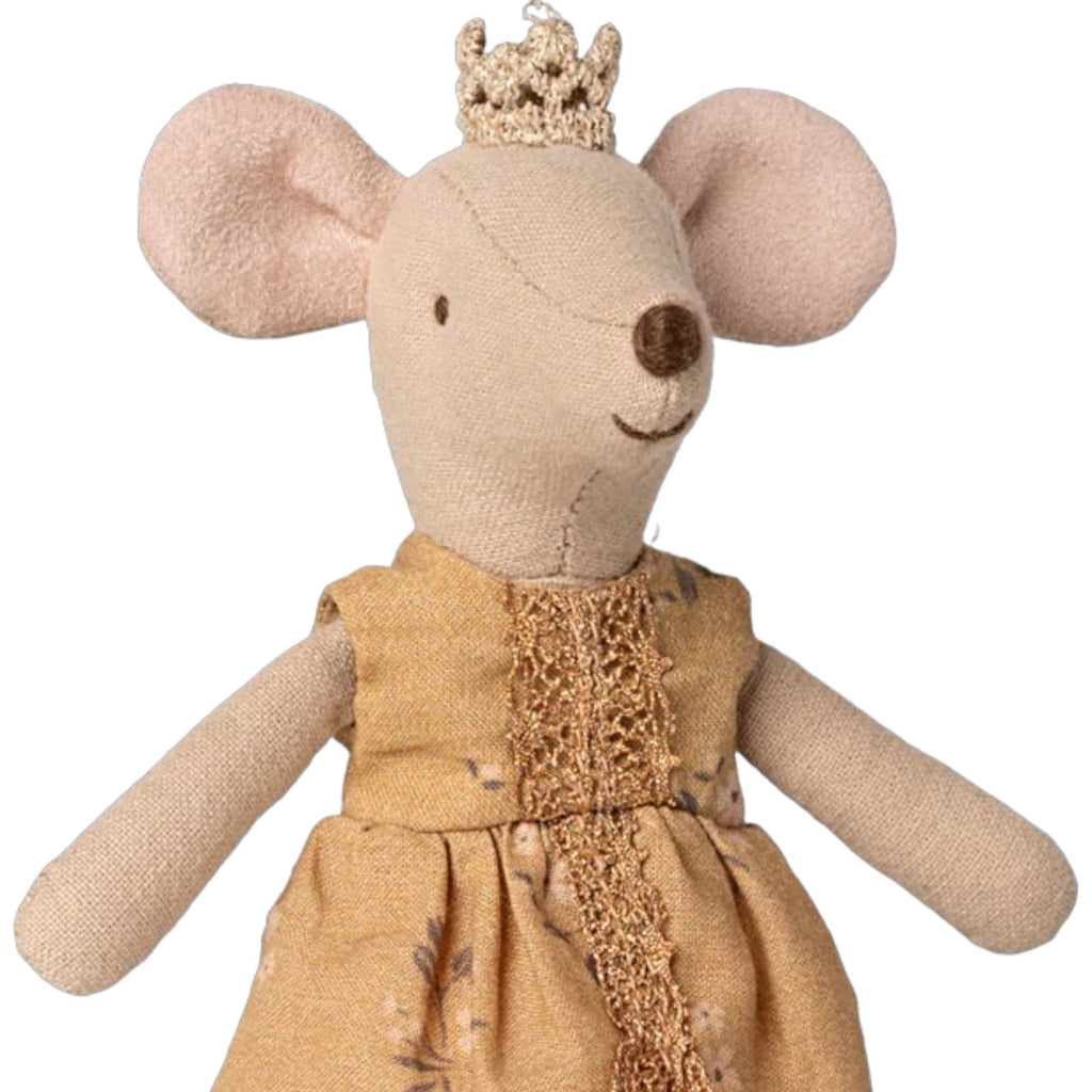 This delightful Princess big sister Maileg mouse comes beautifully dressed in a golden gown with floral details and a delicate lace trim petticoat, complete with a shiny crochet golden crown. Small enough to tuck in a pocket, this princess mouse is sure to be adored by any little one and is perfect to add to your Maileg collection. Mouse size 13cm in height, created from linen, cotton and filled with recycled polyester. Hand wash at 30 degrees. Suitable for children three years and up.